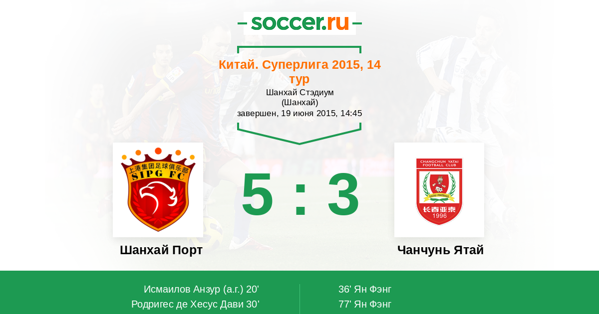 Китай. Суперлига 15.06.2016 Шанхай Порт Логотип футбольный клуб Шанхай Порт 1:1 Логотип футбольный клуб Чанчунь Ятай Чанчунь Ятай