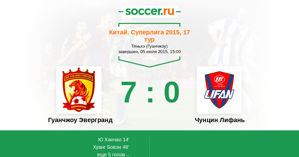 Китай. Суперлига 10.07.2016 Гуанчжоу Эвергранд Логотип футбольный клуб Гуанчжоу Эвергранд 4:1 Логотип футбольный клуб Чунцин Лифань Чунцин Лифань