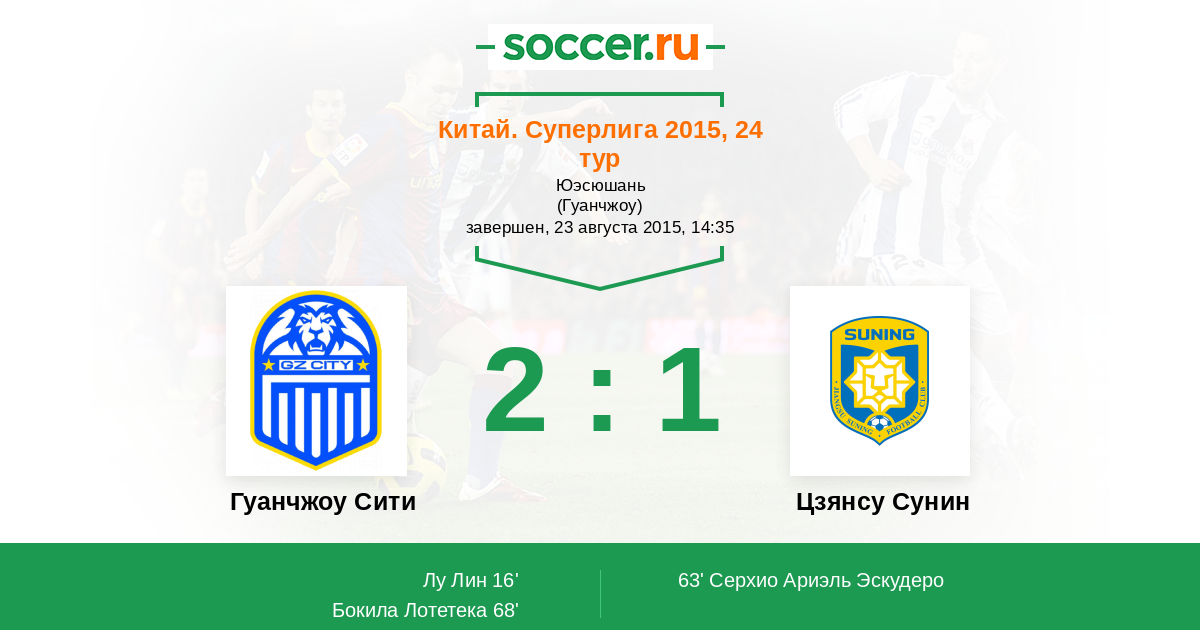 Китай. Суперлига 19.07.2014 Гуанчжоу Сити Логотип футбольный клуб Гуанчжоу Сити 3:2 Логотип футбольный клуб Цзянсу Сунин Цзянсу Сунин