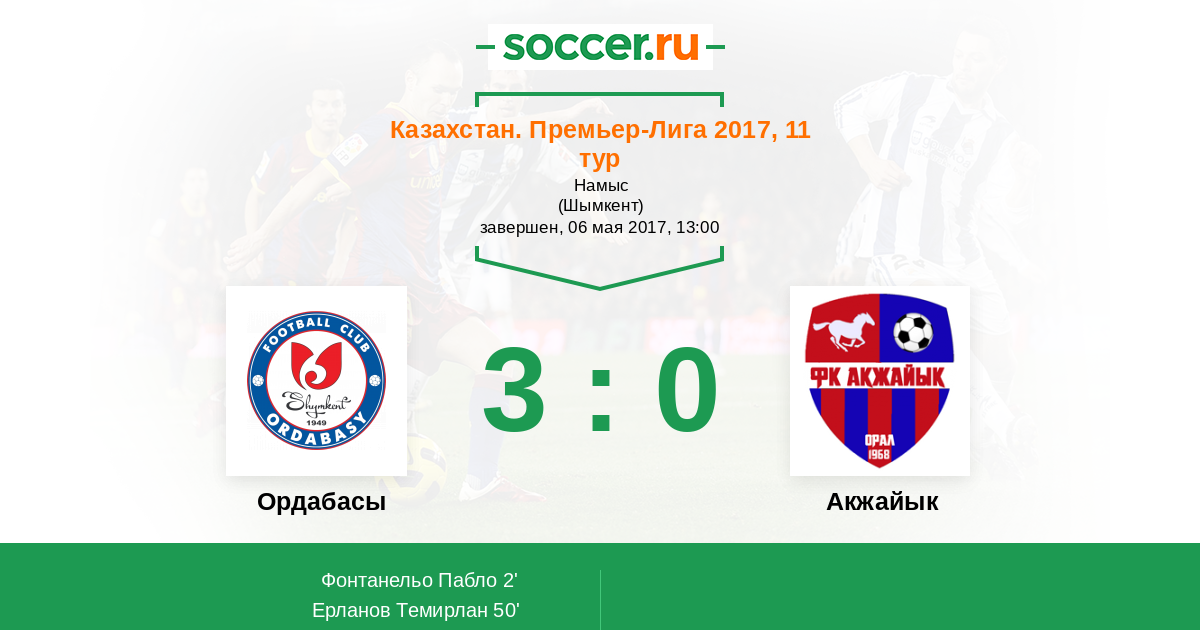 Казахстан. Премьер-лига 06.05.2012 Ордабасы Логотип футбольный клуб Ордабасы (Шымкент) 2:0 Логотип футбольный клуб Акжайык (Уральск) Акжайык