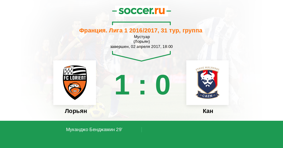 Франция. Лига 1 09.04.2016 Кан Логотип футбольный клуб Кан 1:2 Логотип футбольный клуб Лорьян Лорьян