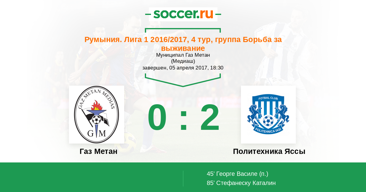 Румыния. Лига 1 04.11.2016 Газ Метан Логотип футбольный клуб Газ Метан (Медиаш) 2:1 Логотип футбольный клуб Политехника Яссы Политехника Яссы