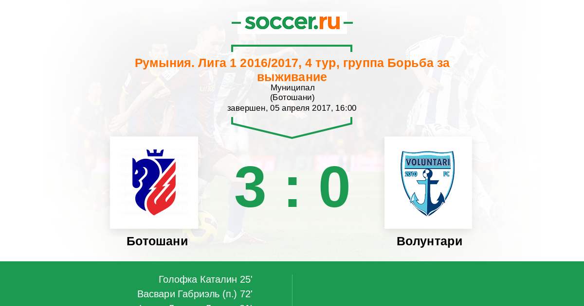 Румыния. Лига 1 07.04.2018 Ботошани Логотип футбольный клуб Ботошани 1:0 Логотип футбольный клуб Волунтари (Илфов) Волунтари