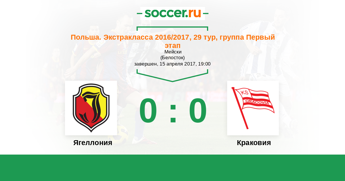 Польша. Кубок 09.08.2016 Краковия Логотип футбольный клуб Краковия 0:1 Логотип футбольный клуб Ягеллония (Белосток) Ягеллония