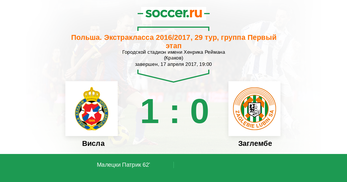 Польша. Экстракласса 09.04.2016 Висла Логотип футбольный клуб Висла (Краков) 1:1 Логотип футбольный клуб Заглембе (Любина) Заглембе