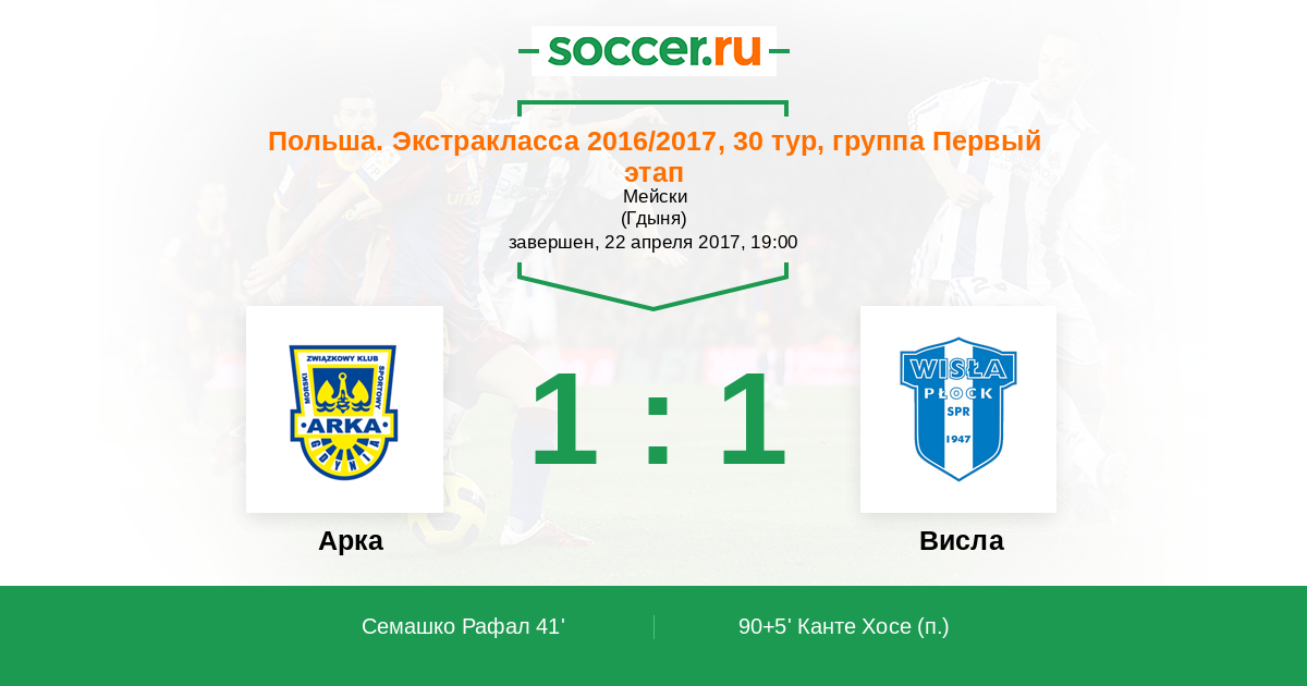 Польша. Экстракласса 16.05.2017 Арка Логотип футбольный клуб Арка (Гдыня) 0:1 Логотип футбольный клуб Висла (Плоцк) Висла
