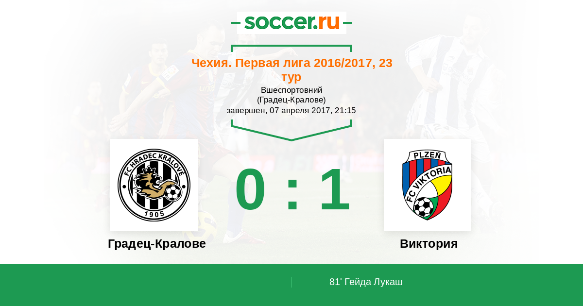 Чехия. Первая Лига 02.10.2016 Виктория Логотип футбольный клуб Виктория (Пльзень) 4:1 Логотип футбольный клуб Градец-Кралове Градец-Кралове