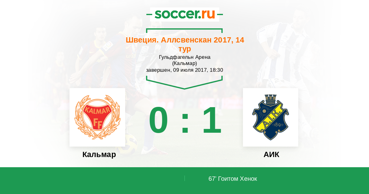 Швеция. Аллсвенскан 30.07.2017 АИК Логотип футбольный клуб АИК (Стокгольм) 0:1 Логотип футбольный клуб Кальмар Кальмар