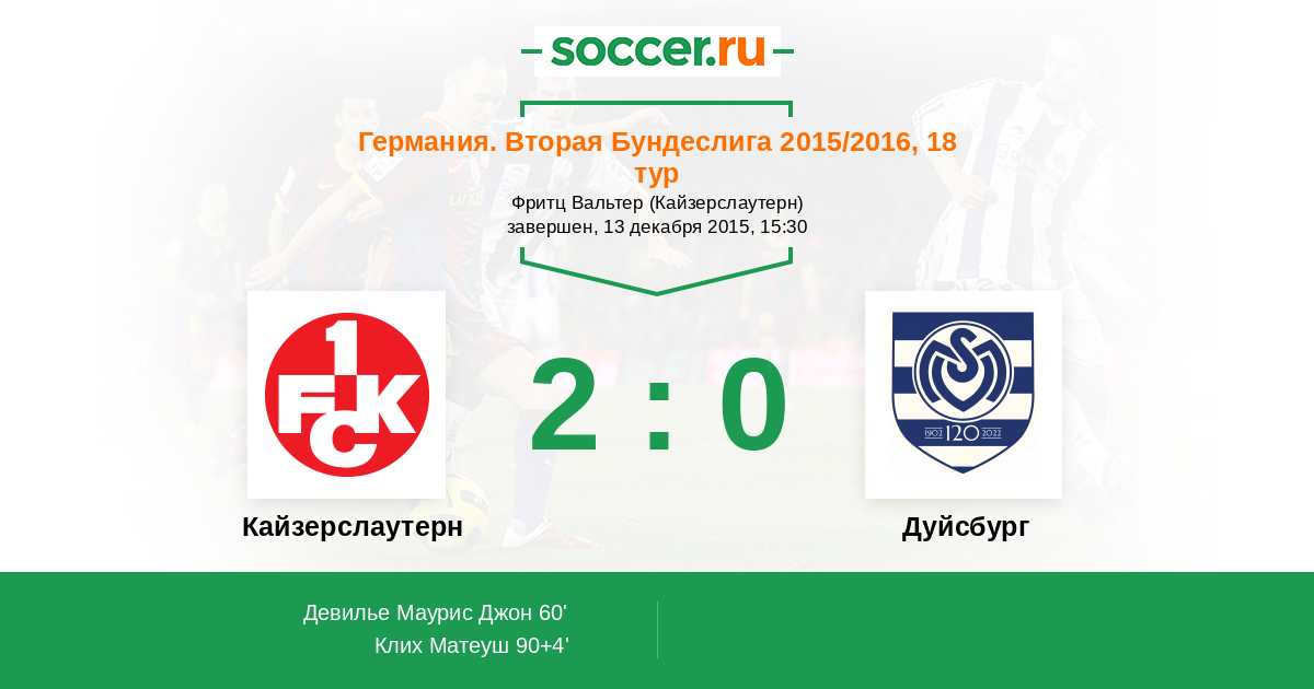 Германия. Бундеслига 2 22.10.2017 Кайзерслаутерн Логотип футбольный клуб Кайзерслаутерн 0:1 Логотип футбольный клуб Дуйсбург Дуйсбург