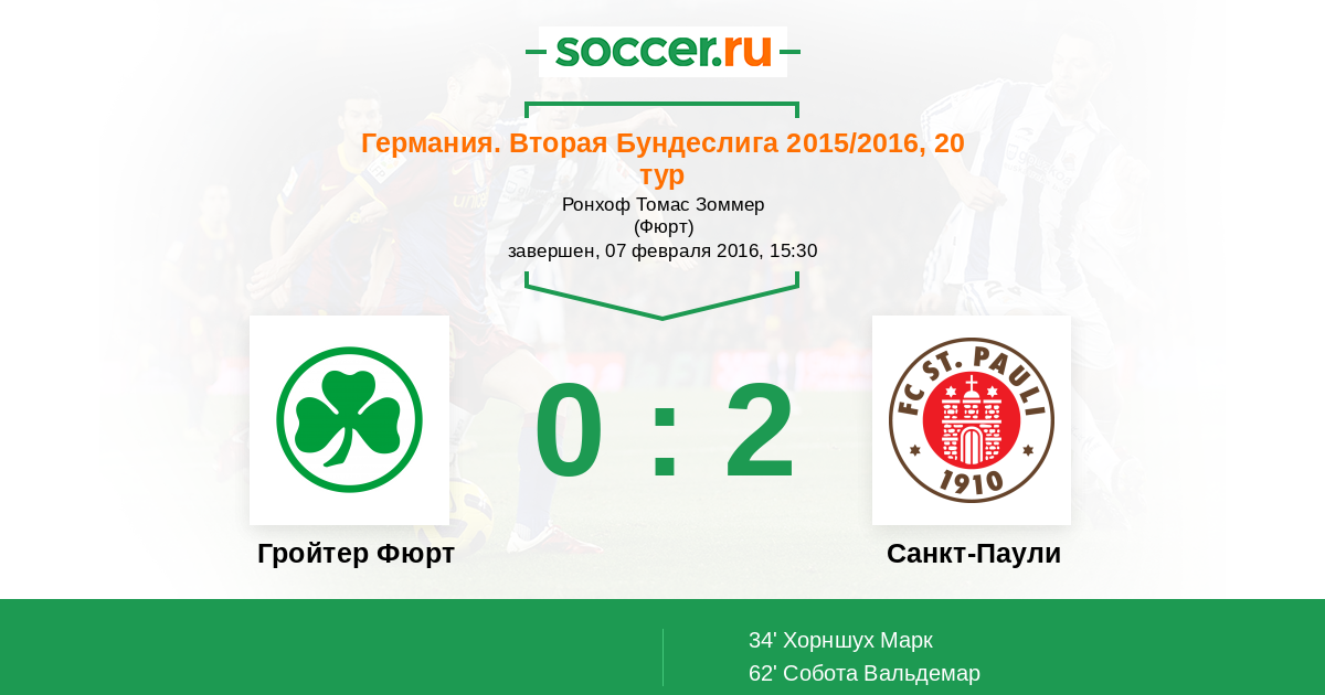 Германия. Бундеслига 2 16.02.2015 Санкт-Паули Логотип футбольный клуб Санкт-Паули (Гамбург) 0:1 Логотип футбольный клуб Гройтер Фюрт Гройтер Фюрт