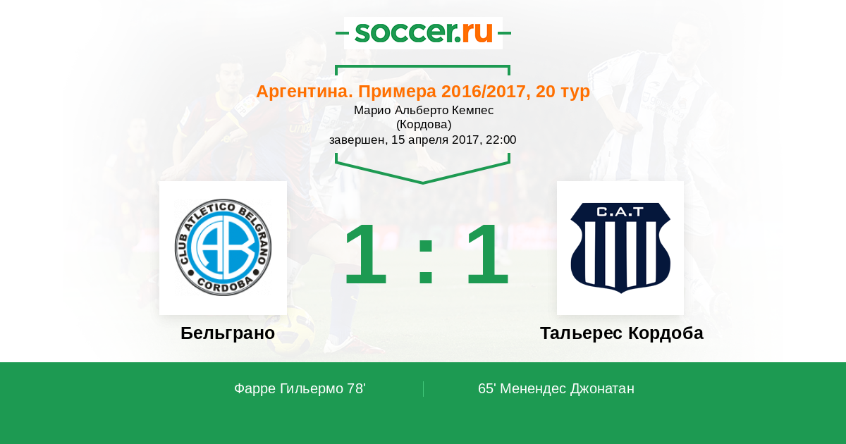 Аргентина. Суперлига 13.05.2017 Тальерес Кордоба Логотип футбольный клуб Тальерес Кордоба 1:1 Логотип футбольный клуб Бельграно (Кордоба) Бельграно