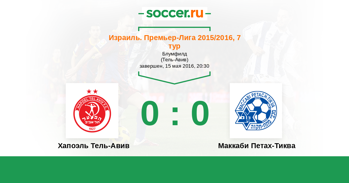 Израиль. Премьер-Лига 05.03.2016 Маккаби Петах-Тиква Логотип футбольный клуб Маккаби Петах-Тиква 1:1 Логотип футбольный клуб Хапоэль Тель-Авив Хапоэль Тель-Авив