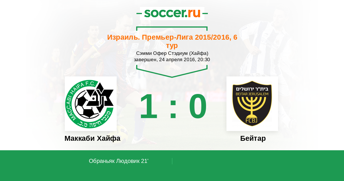 Израиль. Премьер-Лига 05.04.2015 Маккаби Хайфа Логотип футбольный клуб Маккаби Хайфа 1:0 Логотип футбольный клуб Бейтар (Иерусалим) Бейтар
