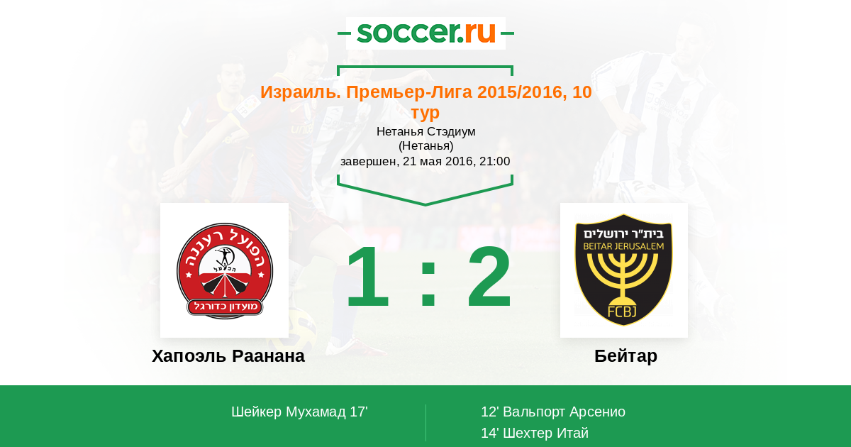 Израиль. Премьер-Лига 18.04.2016 Бейтар Логотип футбольный клуб Бейтар (Иерусалим) 1:0 Логотип футбольный клуб Хапоэль Раанана Хапоэль Раанана