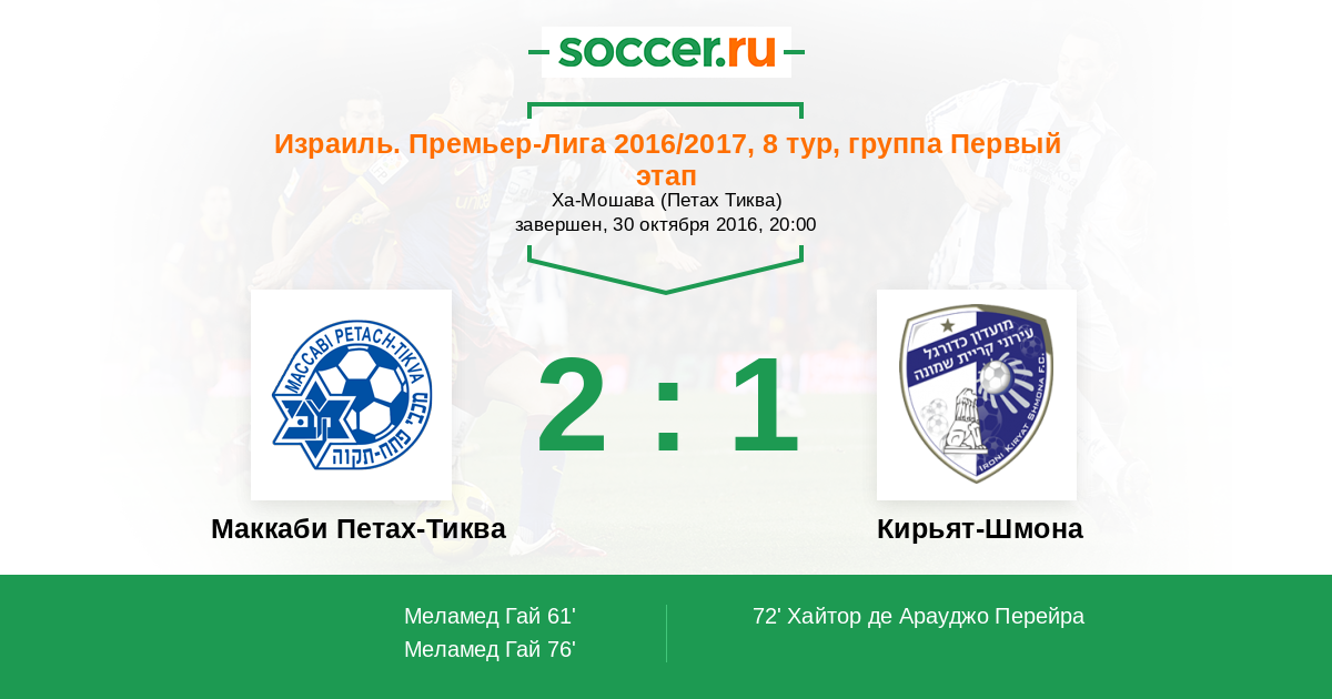 Израиль. Премьер-Лига 10.04.2016 Маккаби Петах-Тиква Логотип футбольный клуб Маккаби Петах-Тиква 2:0 Логотип футбольный клуб Кирьят-Шмона Кирьят-Шмона