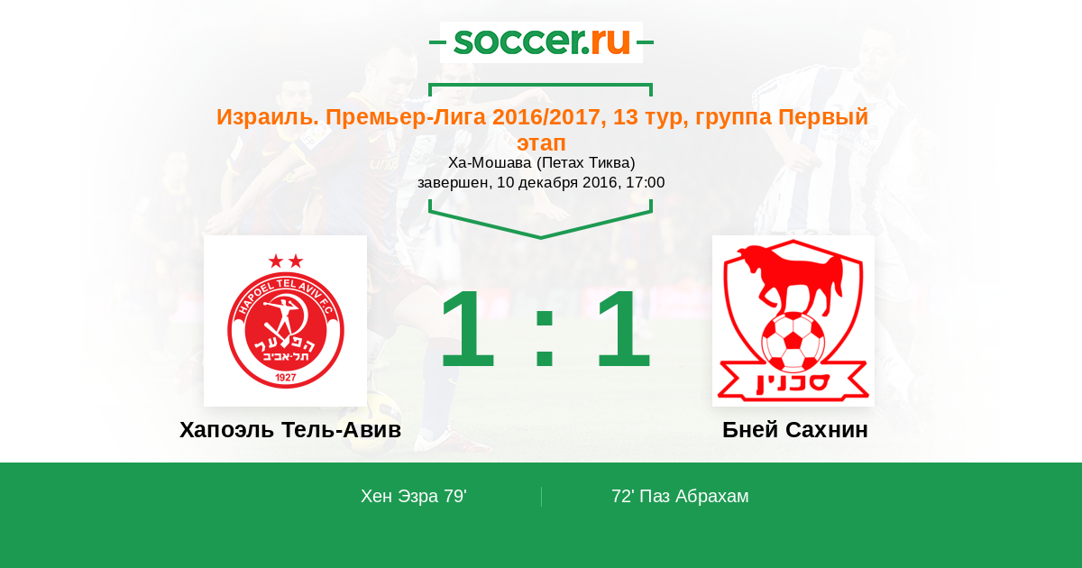 Израиль. Премьер-Лига 17.10.2015 Хапоэль Тель-Авив Логотип футбольный клуб Хапоэль Тель-Авив 0:4 Логотип Бней Сахнин Бней Сахнин
