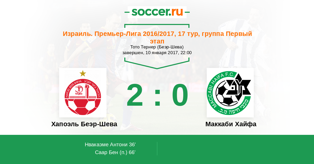 Израиль. Премьер-Лига 19.03.2017 Хапоэль Беэр-Шева Логотип футбольный клуб Хапоэль Беэр-Шева 4:0 Логотип футбольный клуб Маккаби Хайфа Маккаби Хайфа