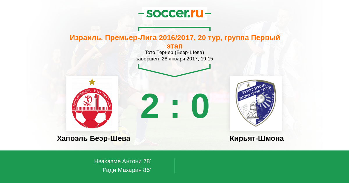 Израиль. Премьер-Лига 24.10.2016 Кирьят-Шмона Логотип футбольный клуб Кирьят-Шмона 0:2 Логотип футбольный клуб Хапоэль Беэр-Шева Хапоэль Беэр-Шева