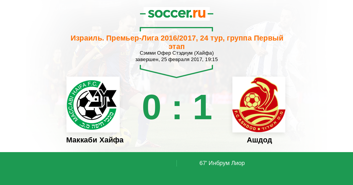 Израиль. Премьер-Лига 12.02.2011 Ашдод Логотип футбольный клуб Ашдод 1:2 Логотип футбольный клуб Маккаби Хайфа Маккаби Хайфа