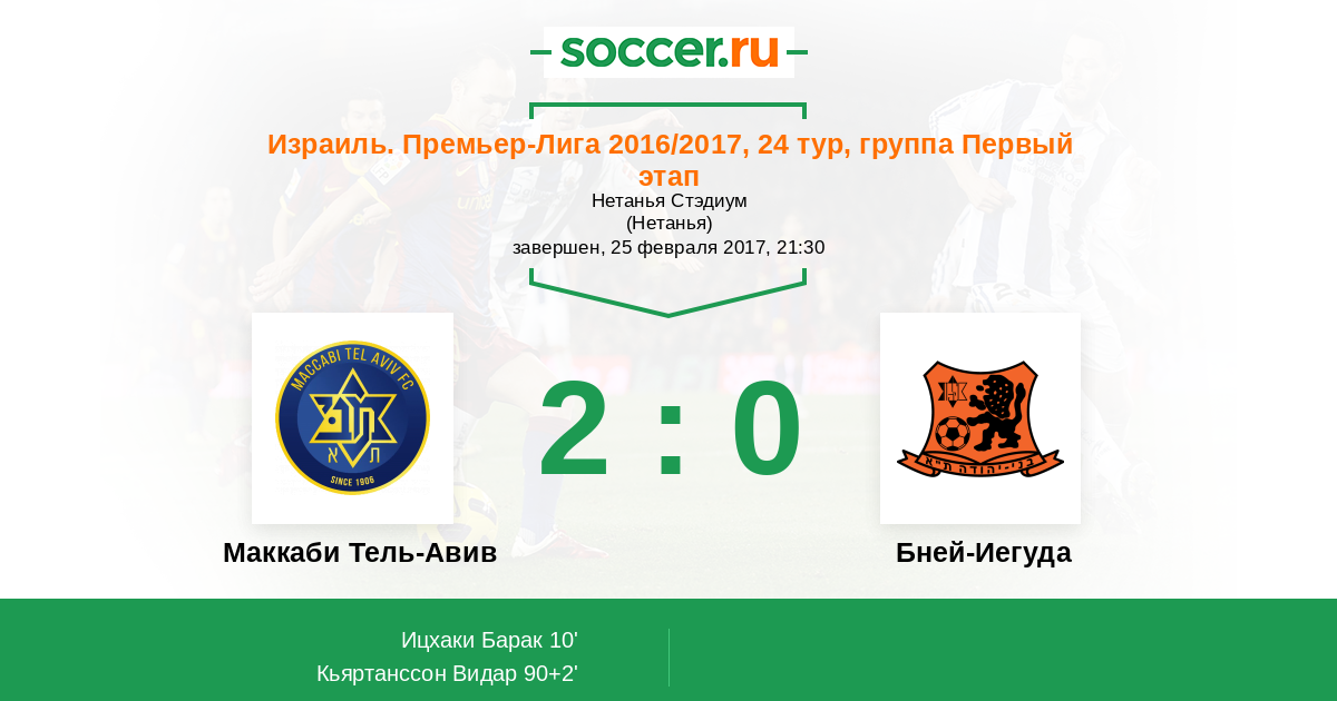 Израиль. Премьер-Лига 02.04.2011 Бней-Иегуда Логотип футбольный клуб Бней-Иегуда (Тель-Авив) 2:0 Логотип футбольный клуб Маккаби Тель-Авив Маккаби Тель-Авив
