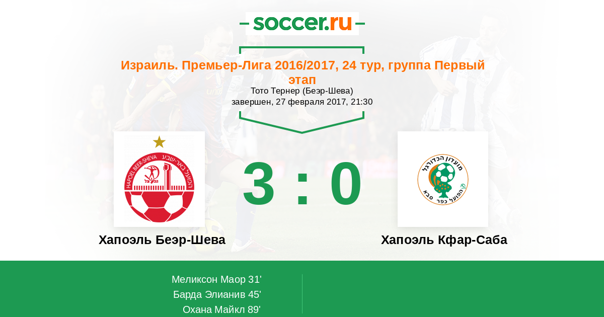 Израиль. Премьер-Лига 28.02.2016 Хапоэль Кфар-Саба Логотип футбольный клуб Хапоэль Кфар-Саба 1:2 Логотип футбольный клуб Хапоэль Беэр-Шева Хапоэль Беэр-Шева