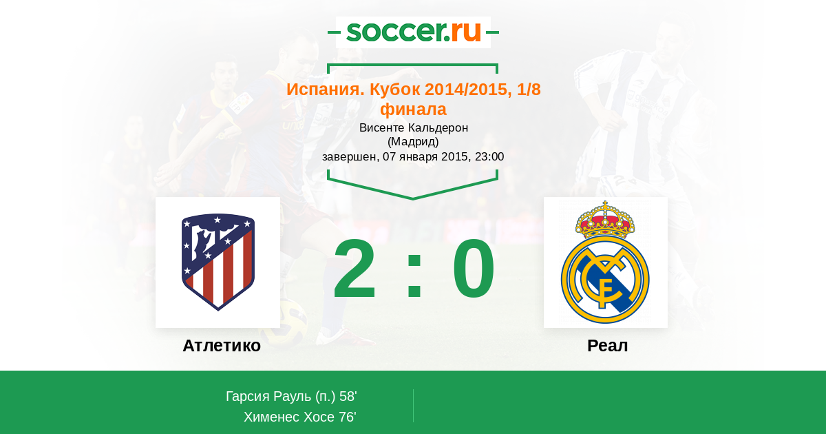 Испания. Кубок 12.02.2014 Атлетико Логотип футбольный клуб Атлетико (Мадрид) 0:2 Логотип футбольный клуб Реал (Мадрид) Реал