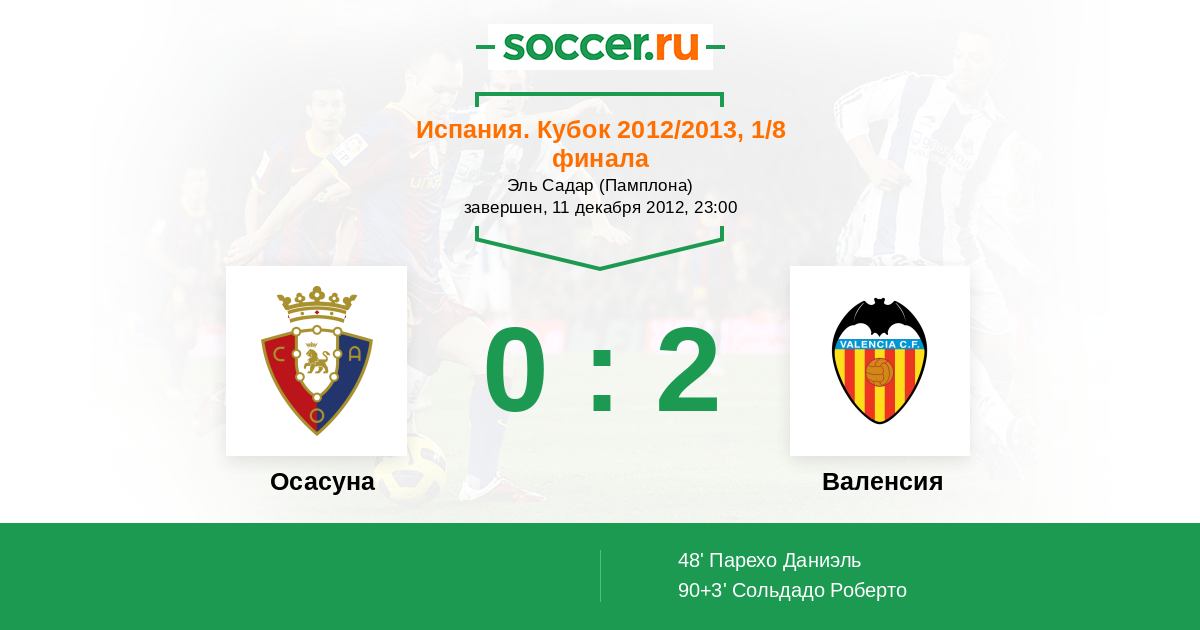 Испания. Примера 09.12.2012 Осасуна Логотип футбольный клуб Осасуна (Памплона) 0:1 Логотип футбольный клуб Валенсия Валенсия