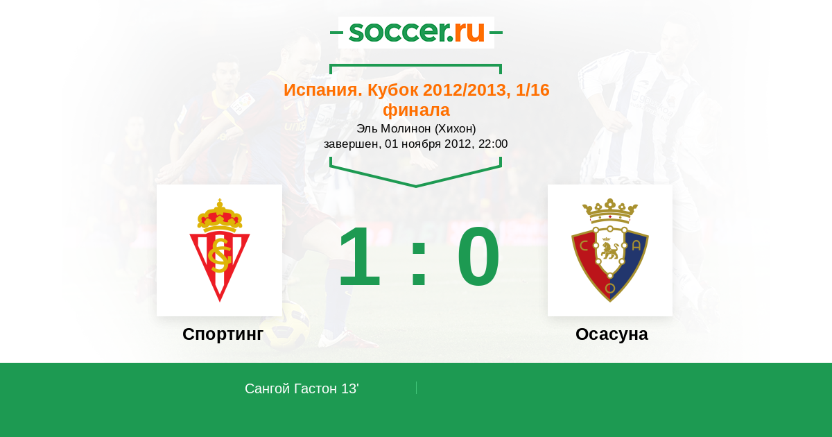 Испания. Кубок 27.11.2012 Осасуна Логотип футбольный клуб Осасуна (Памплона) 2:0 Логотип футбольный клуб Спортинг (Хихон) Спортинг