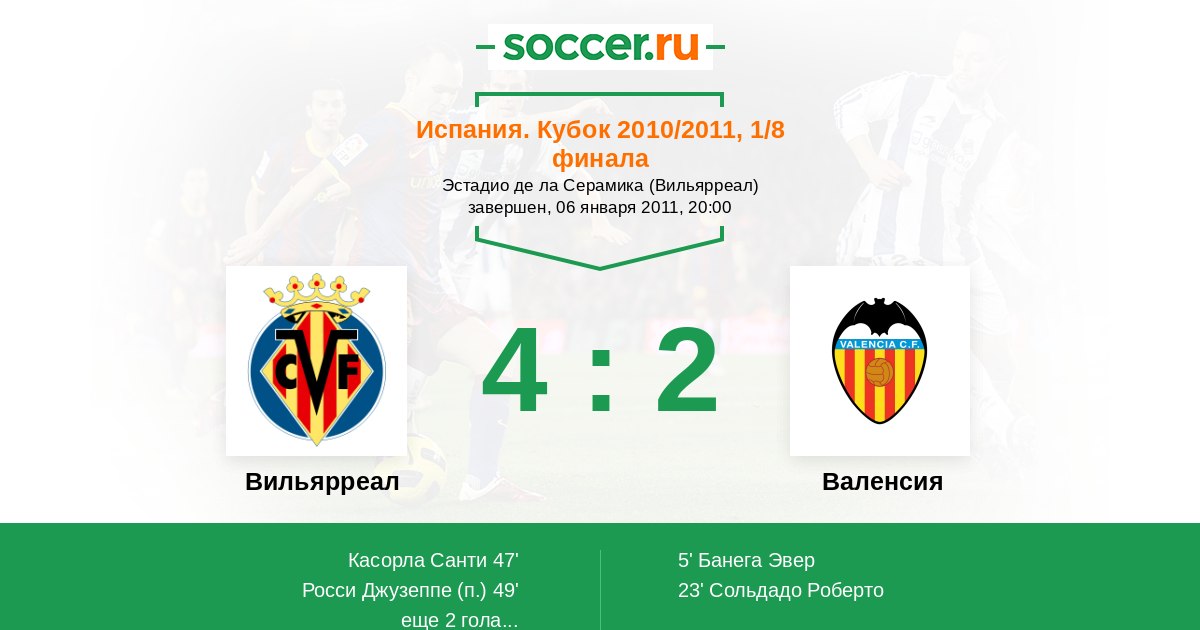 Испания. Кубок 22.12.2010 Валенсия Логотип футбольный клуб Валенсия 0:0 Логотип футбольный клуб Вильярреал Вильярреал