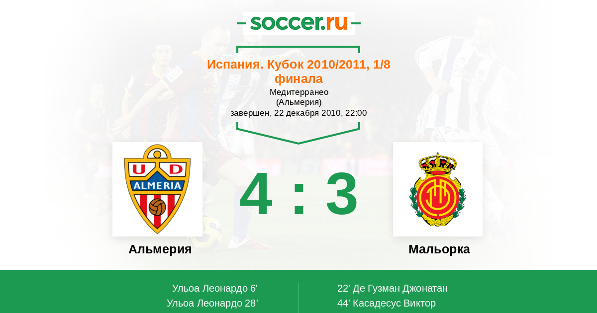 Испания. Кубок 06.01.2011 Мальорка Логотип футбольный клуб Мальорка (Пальма-де-Мальорка) 3:4 Логотип футбольный клуб Альмерия Альмерия