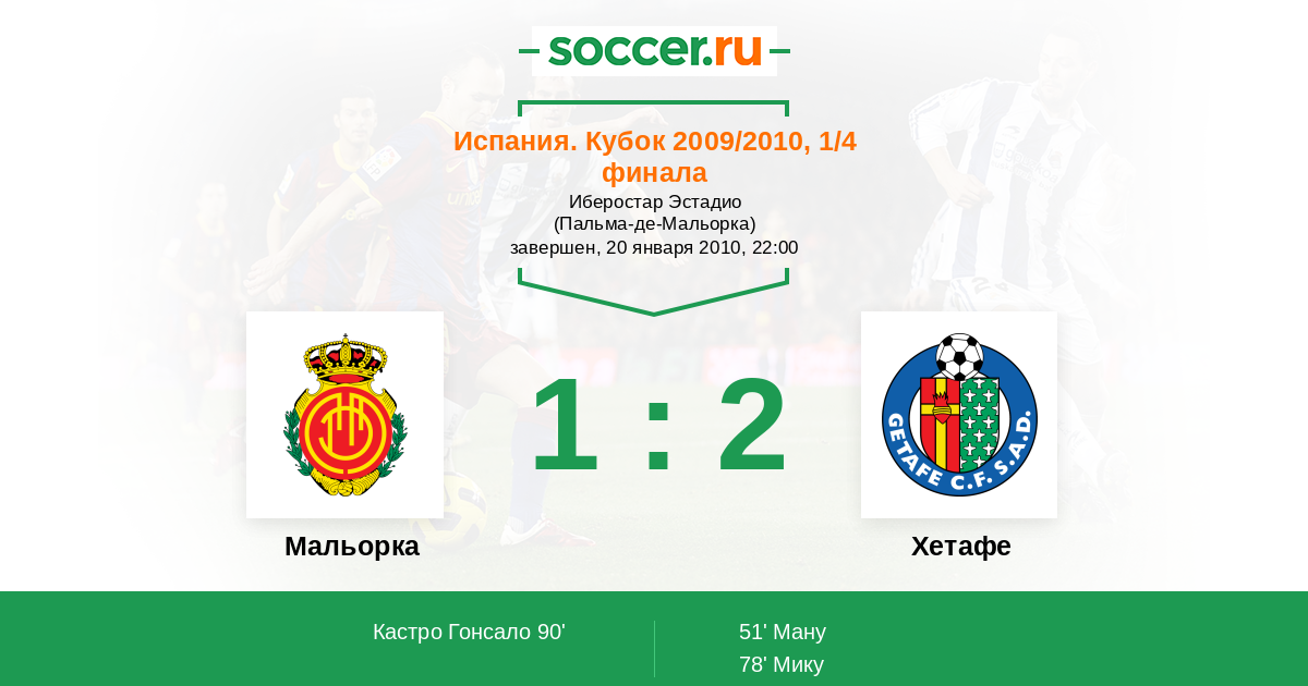 Испания. Кубок 28.01.2010 Хетафе Логотип футбольный клуб Хетафе 0:1 Логотип футбольный клуб Мальорка (Пальма-де-Мальорка) Мальорка