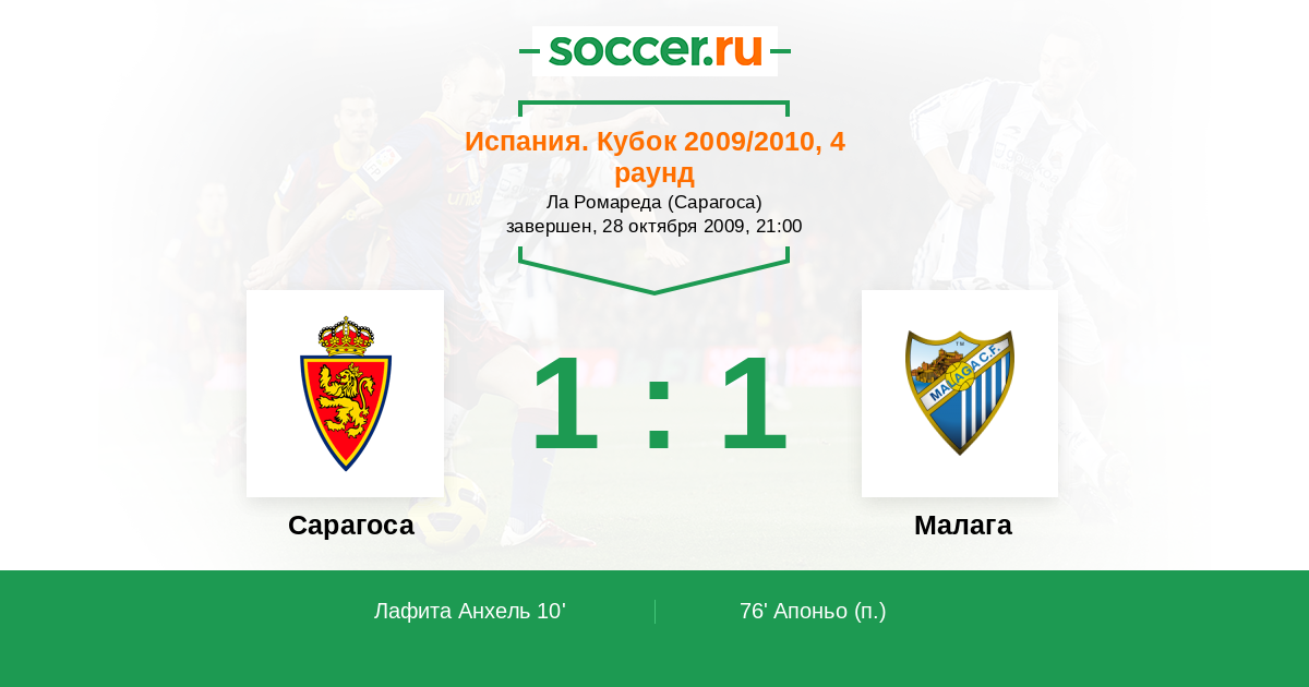 Испания. Кубок 10.11.2009 Малага Логотип футбольный клуб Малага 0:0 Логотип футбольный клуб Сарагоса Сарагоса