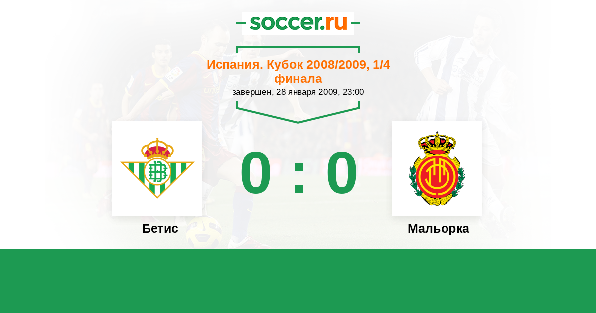 Испания. Кубок 22.01.2009 Мальорка Логотип футбольный клуб Мальорка (Пальма-де-Мальорка) 1:0 Логотип футбольный клуб Бетис (Севилья) Бетис