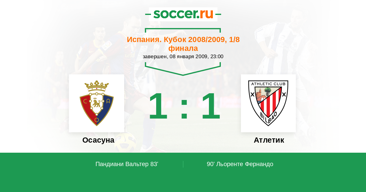 Испания. Кубок 15.01.2009 Атлетик Логотип футбольный клуб Атлетик (Бильбао) 2:0 Логотип футбольный клуб Осасуна (Памплона) Осасуна