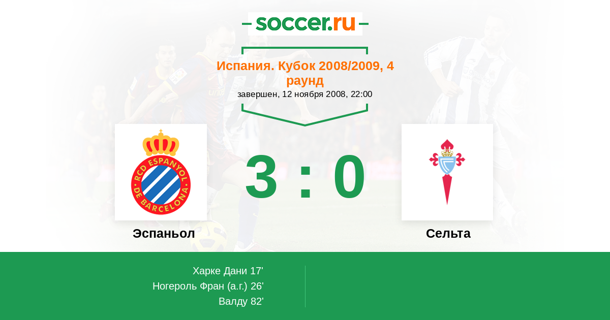 Испания. Кубок 29.10.2008 Сельта Логотип футбольный клуб Сельта (Виго) 2:2 Логотип футбольный клуб Эспаньол (Барселона) Эспаньол