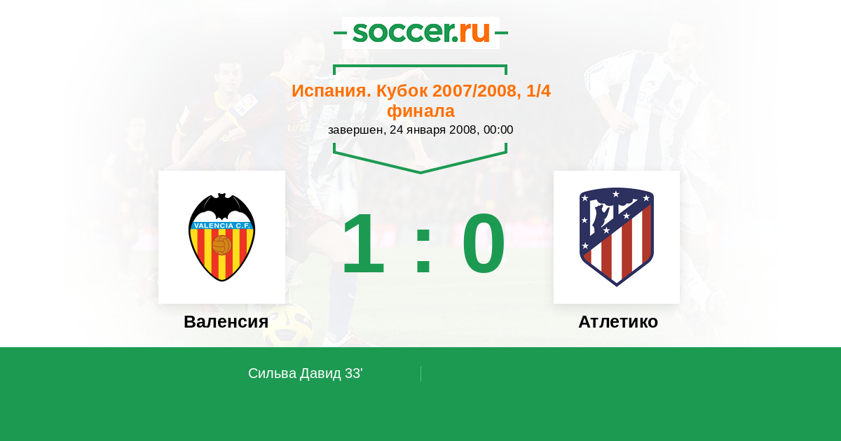 Испания. Кубок 30.01.2008 Атлетико Логотип футбольный клуб Атлетико (Мадрид) 3:2 Логотип футбольный клуб Валенсия Валенсия
