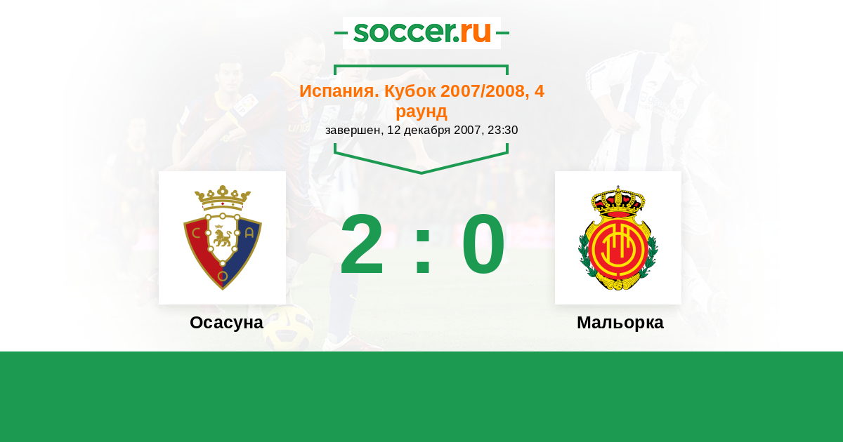 Испания. Кубок 02.01.2008 Мальорка Логотип футбольный клуб Мальорка (Пальма-де-Мальорка) 4:0 Логотип футбольный клуб Осасуна (Памплона) Осасуна