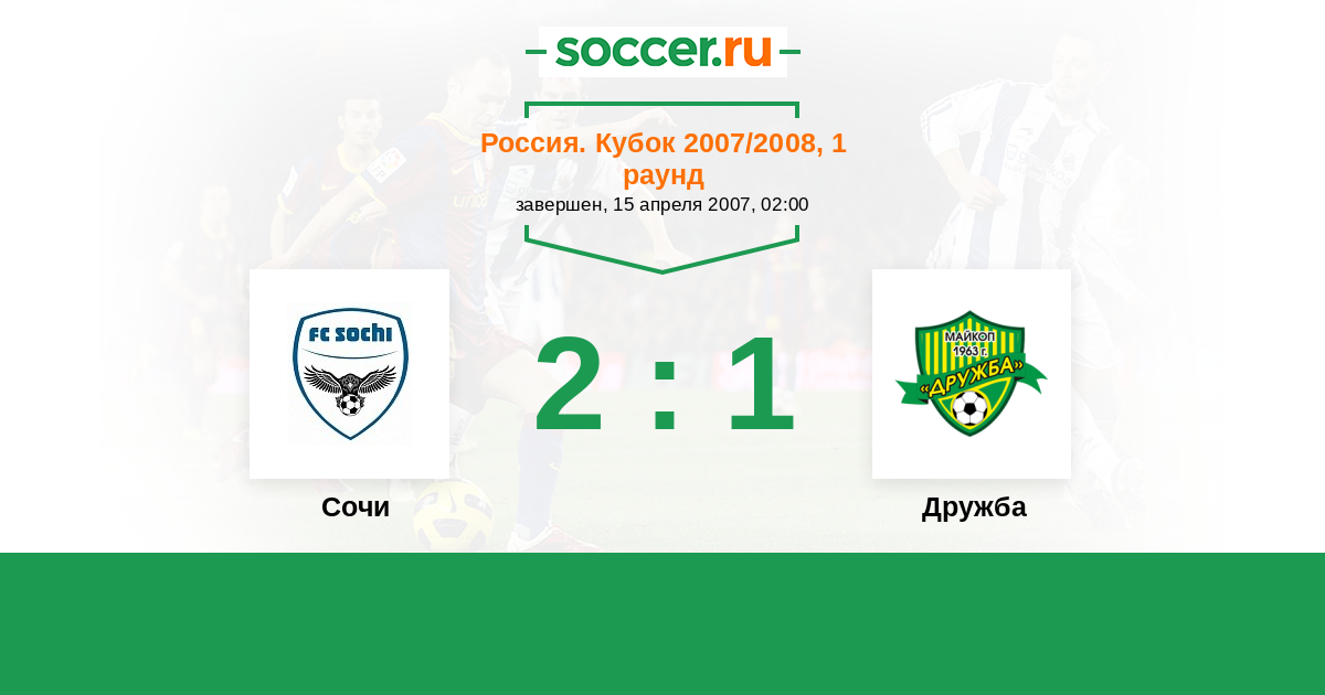 Россия. Кубок 26.04.2006 Сочи Логотип футбольный клуб Сочи 0:0 (2:4) Логотип футбольный клуб Дружба (Майкоп) Дружба