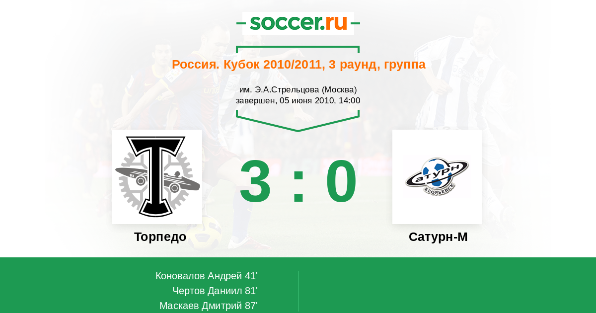 Россия. Вторая лига. Группа 3 10.07.2010 Торпедо Логотип футбольный клуб Торпедо (Москва) 2:1 Логотип футбольный клуб Сатурн-2 (Раменское) Сатурн-2