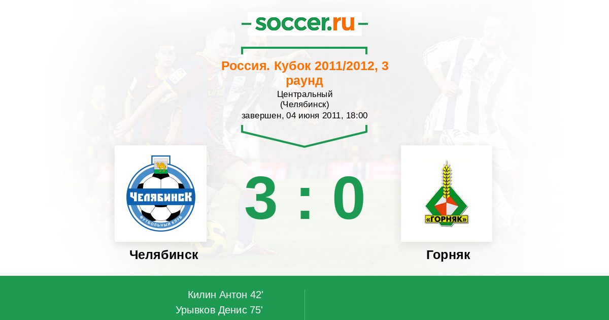 Россия. Вторая лига. Группа 4 14.05.2011 Челябинск Логотип футбольный клуб Челябинск 0:2 Логотип футбольный клуб Горняк (Учалы) Горняк