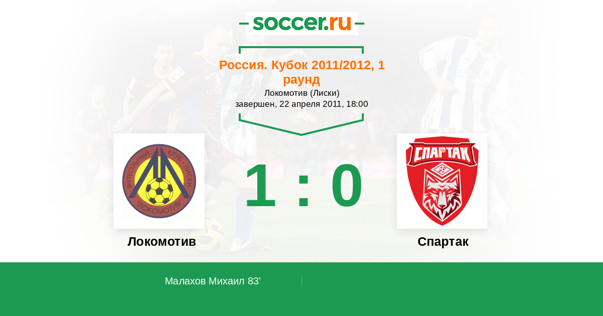 Россия. Вторая лига. Группа 3 13.07.2011 Спартак Логотип футбольный клуб Спартак (Тамбов) 1:2 Логотип футбольный клуб Локомотив (Лиски) Локомотив