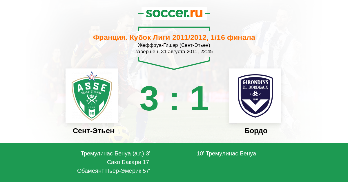 Франция. Лига 1 07.08.2011 Бордо Логотип футбольный клуб Бордо 1:2 Логотип футбольный клуб Сент-Этьен Сент-Этьен