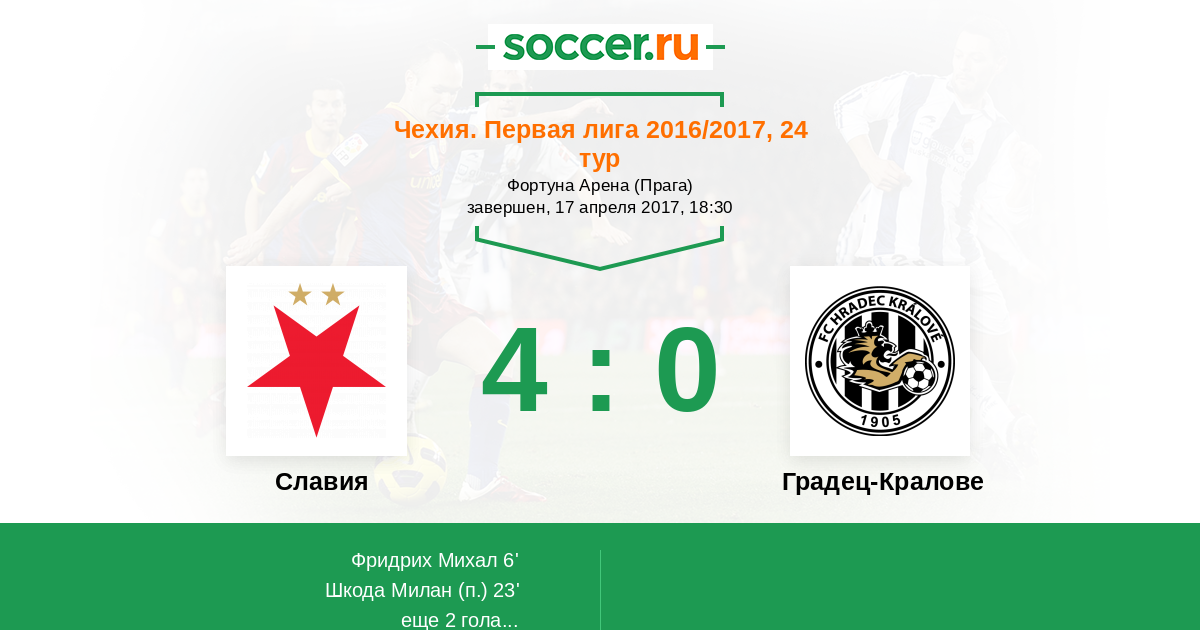Чехия. Первая Лига 03.05.2012 Славия Логотип футбольный клуб Славия (Прага) 5:0 Логотип футбольный клуб Градец-Кралове Градец-Кралове