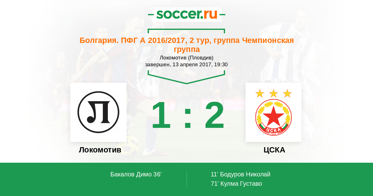 Болгария. Первая лига 18.03.2017 Локомотив Логотип футбольный клуб Локомотив (Пловдив) 1:1 Логотип футбольный клуб ЦСКА (София) ЦСКА