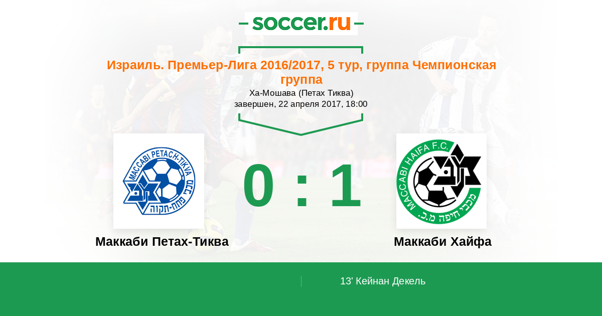 Израиль. Премьер-Лига 21.04.2018 Маккаби Петах-Тиква Логотип футбольный клуб Маккаби Петах-Тиква 0:1 Логотип футбольный клуб Маккаби Хайфа Маккаби Хайфа