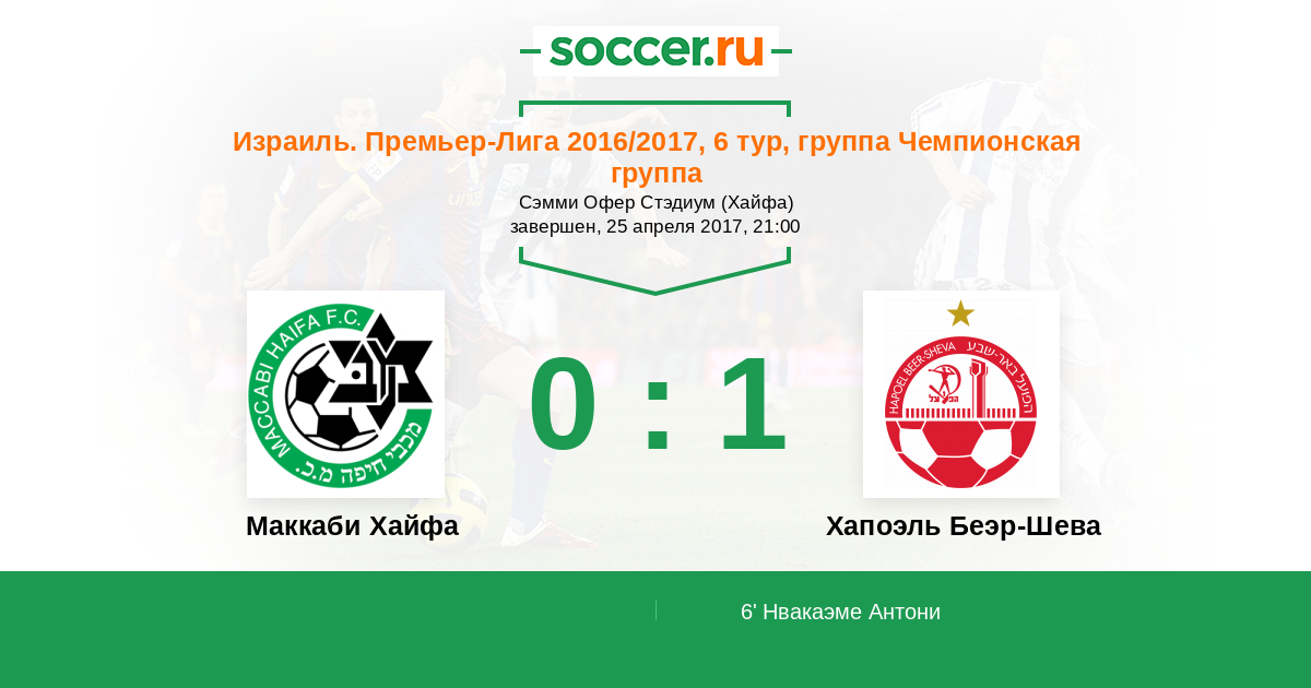 Израиль. Премьер-Лига 19.04.2014 Маккаби Хайфа Логотип футбольный клуб Маккаби Хайфа 2:1 Логотип футбольный клуб Хапоэль Беэр-Шева Хапоэль Беэр-Шева