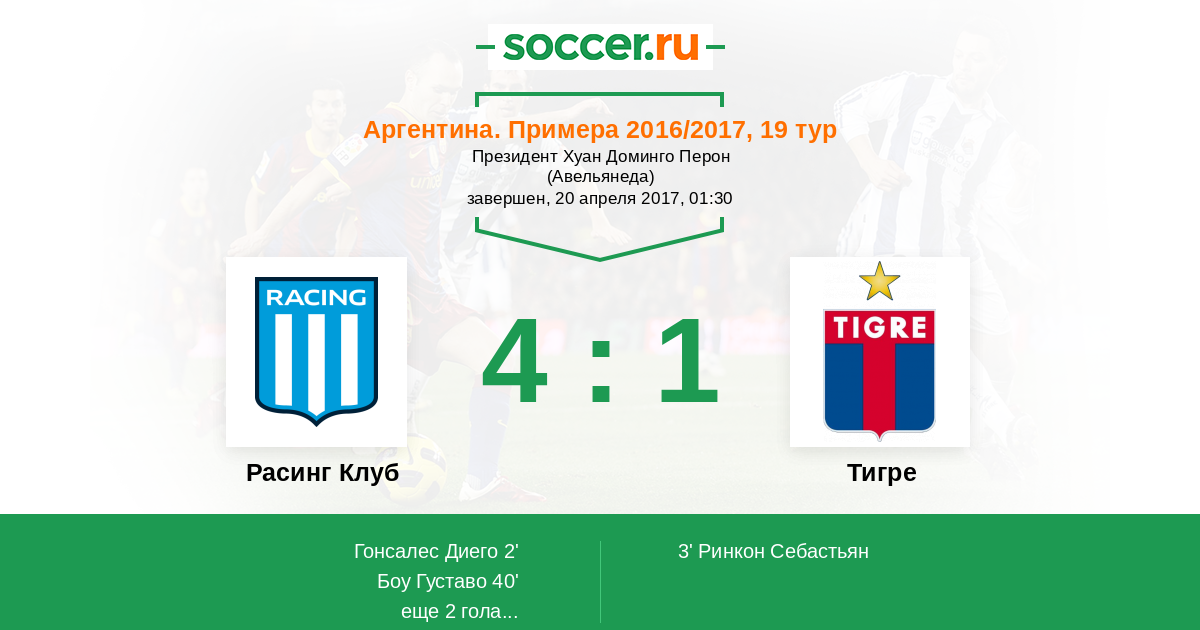 Аргентина. Суперлига 15.10.2017 Расинг Клуб Логотип футбольный клуб Расинг Клуб (Авельянеда) 1:0 Логотип футбольный клуб Тигре (Буэнос-Айрес) Тигре