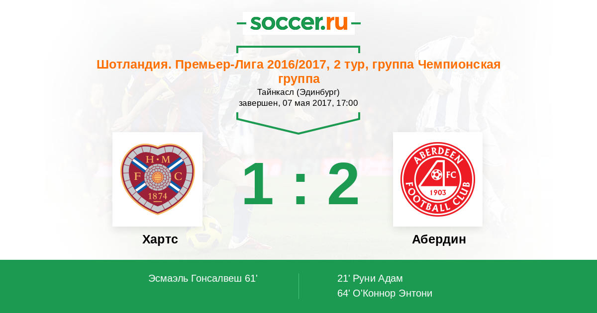 Шотландия. Премьер-Лига 18.03.2017 Абердин Логотип футбольный клуб Абердин 2:0 Логотип футбольный клуб Хартс (Эдинбург) Хартс