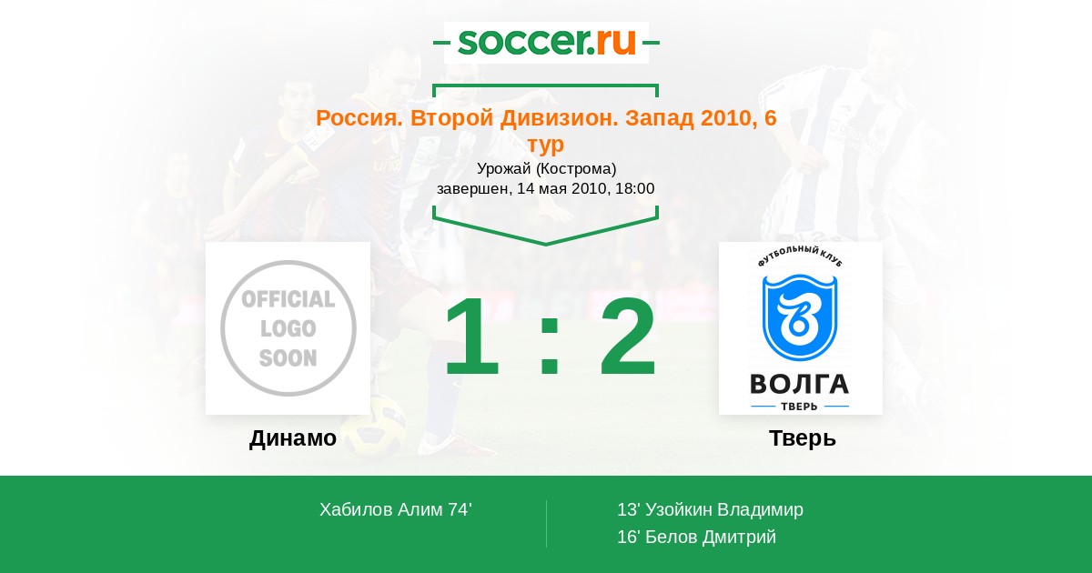 Россия. Вторая лига. Группа 2 15.05.2012 Тверь Логотип футбольный клуб Тверь 1:0 Логотип футбольный клуб Динамо (Кострома) Динамо