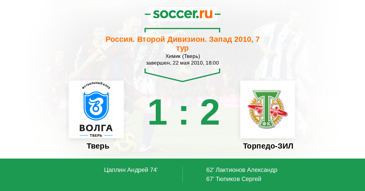 Россия. Вторая лига. Группа 2 25.08.2010 Торпедо-ЗИЛ Логотип футбольный клуб Торпедо-ЗИЛ (Москва) 1:1 Логотип футбольный клуб Тверь Тверь
